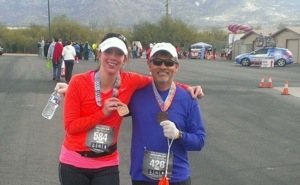 I had the pleasure of spending much of the Tucson Marathon weekend with Meghan, my long time running partner from my days of living in Colorado and her running partner in Tucson, Elke. The race weekend began on Friday evening when Meghan, Elke and I drove to the expo to pickup our race numbers. We arrived relatively late at the small expo which had just a few running gear booths and proceeded to the lightly populated registration area where we were processed in just a few minutes. Knowing that the race forecast was for cool weather, we each purchased a pair of cheap cotton gloves that we could discard at an aid station if they became too warm during the race. We dropped Elke off at her home, picked up a pizza and made our way to the home of Meghan, her husband Neil and daughter Gretchen. After catching up on the happenings of our lives since we last saw each other nearly a year ago, we called it night.